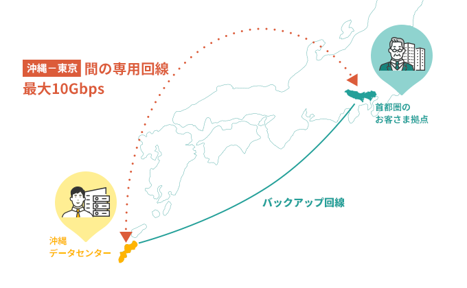 西東京データセンターへお客さま手配回線を引き込むことにより、沖縄データセンターへの接続が可能となります。その際、西東京データセンターのラック契約は不要です。