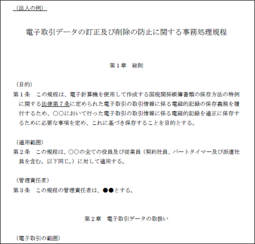 国税庁のHPにはこの事務処理規程のサンプルが掲載されています。それぞれの会社の業務の形に合わせて規定を整備・運用することで、新たなコストを生まずに真実性を確保することが可能です。