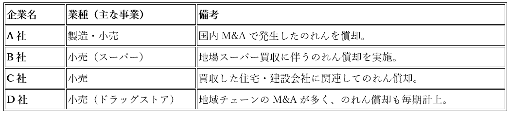 のれん償却の有無については、各社の有価証券報告書や決算短信で確認し、例として挙げています。