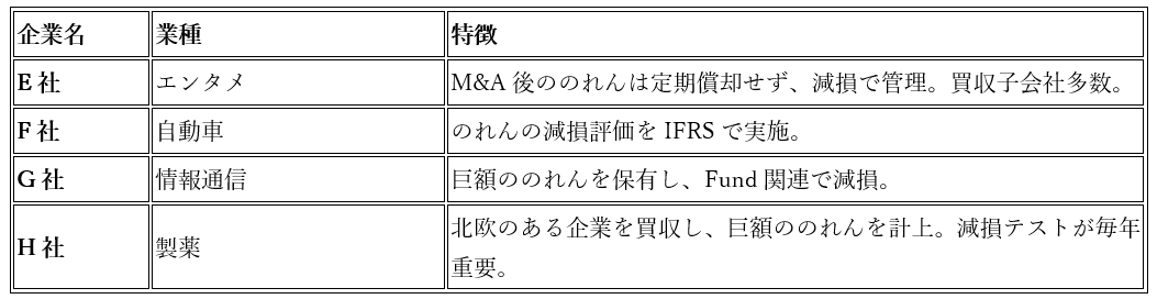 - 上記4社はいずれも国際会計基準を適用しており、のれんを定期的に償却していませんが、その代わりに、毎年のれんの減損テストを実施し、価値が著しく低下した場合に一括で損失計上します。