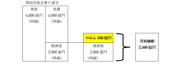 たとえば、次の図のように、資産(時価)が6,000億円、負債(時価)が4,000億円の企業を、2,500億円で買収するケースを考えてみましょう。買収対象となる企業の資産と負債の差額(時価純資産)は資産(時価)6,000億円-負債(時価)4,000億円=2,000億円なので、買収価額2,500億円と時価純資産2,000億円の差額500億円がのれんになります。これが、買収時点における会計帳簿上の企業評価額2,000億円よりも、買い手である買収企業が高く評価するプレミアム部分といえます。具体的な内容の例としては、長い社歴やそれに伴う信用、これまでの取引先のリスト、蓄積したノウハウや技術、将来にわたって稼ぐであろうキャッシュフローの増加分、将来的な新発明や新市場開拓の可能性など、会計帳簿には表れない優れた部分を評価したものであり、会計の世界では「超過収益力」とも呼ばれている無形の価値です。