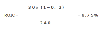 ROICを計算するうえで、分子の利益は税引き後の営業利益を用いますので、実効税率(財務上の利益に対する実質的な税率)を30%と仮定すると、ROICは8.75%と計算されます。
