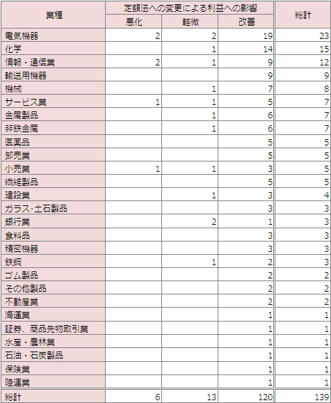 まず、定額法に変更した企業を業種別にまとめたのが以下の表です。