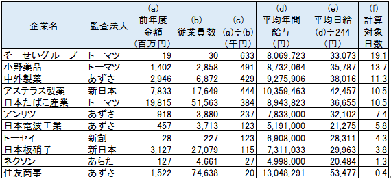 (2)(e)の平均日数を計算するために、(d)の平均年間給与を2013年度の平日である244日で除しているが、実際の勤務日数は、各社の休日が同じではないので、不正確になる可能性があります。