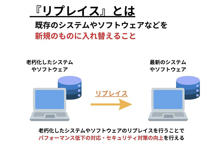 基幹システムのリプレイスとは、企業の業務を支える基幹となるシステムを新しいシステムに置き換えることです。古いシステムが老朽化したり、業務の変化に追従できなくなったりした場合に行われるのが一般的です。