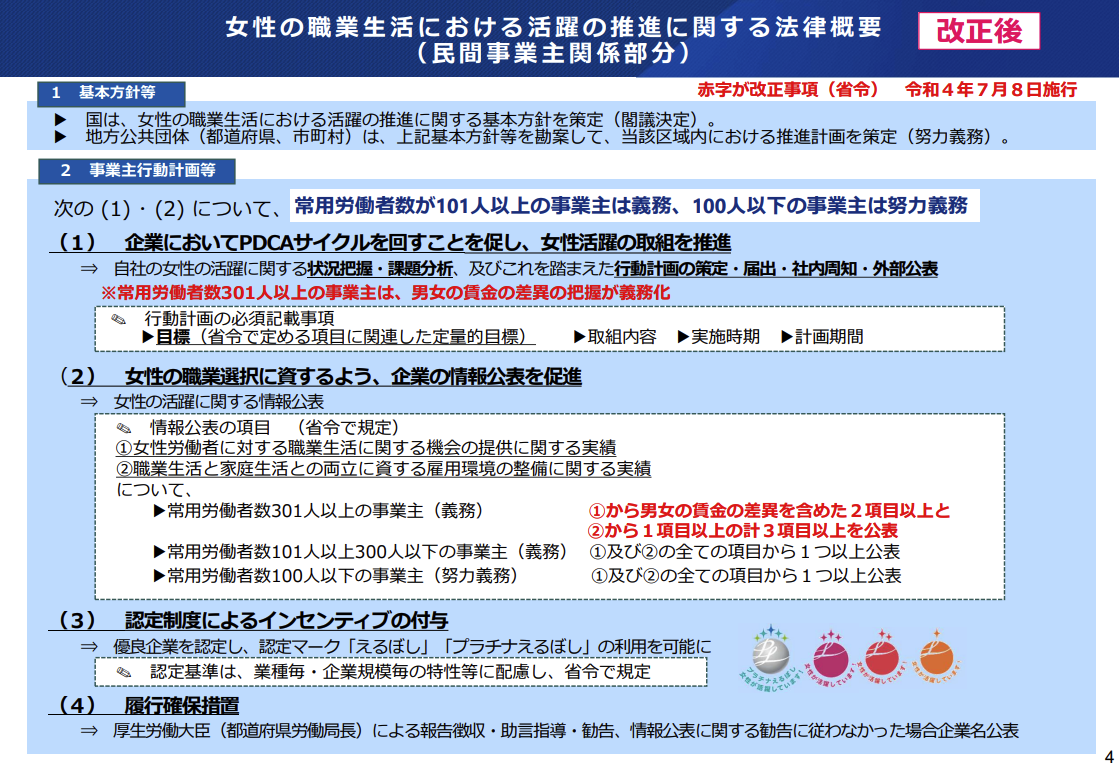 女性活躍推進法に基づき、常時雇用する労働者が301人以上の事業主は、男女の賃金の差異を公表する必要があります。この公表は、自社の女性活躍推進の取り組みや実情を正しく理解してもらうために重要です。