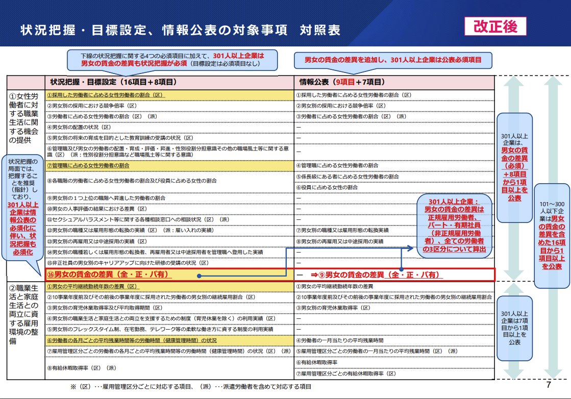 これらの指標の公表については、常時雇用する労働者数が301人以上の事業主は、男女の賃金の差異とともに必須で公表する必要があります。また、常時雇用する労働者数が101人以上300人以下の事業主は、上記の表にある16項目のうち、任意の1項目以上を公表しなければなりません。