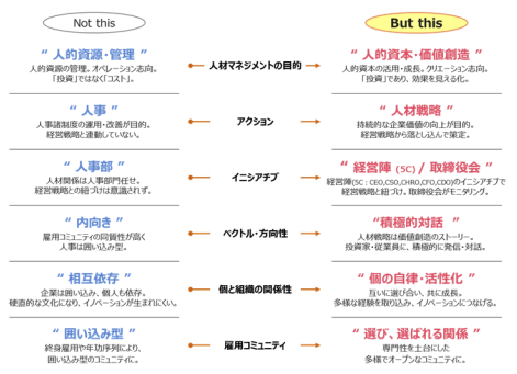 このような時代背景から、経済産業省では、人材戦略を変革する方向性として以下の表を作成して発表しました。