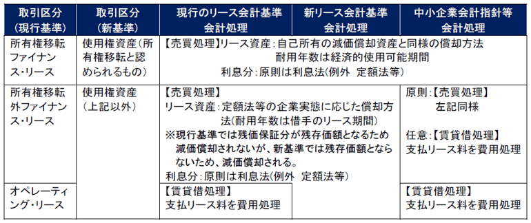 リース取引については、大企業等は「リース会計基準(現行・新)」に準拠し、中小企業は基本的には「中小企業の会計に関する指針等(以下「中小企業会計指針等」)に準拠して会計処理を行います。「中小企業会計指針等」の特徴は、所有権移転外ファイナンス・リースについても、賃貸借処理が認められている点となります。