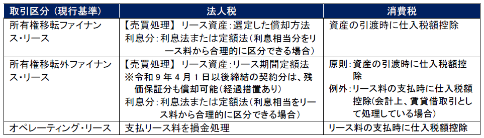 現行の「リース会計基準」及び「中小企業会計指針等」と、法人税法は基本的には税務の取扱いと会計処理が一致した状態といえます。「中小企業会計指針等」の所有権移転外ファイナンス・リースについて賃貸借処理を行った場合でも、リース料がリース期間で均等で支払われるものであれば、費用処理金額と法人税のリース期間定額法の償却限度額が一致するため税務調整が不要となります。