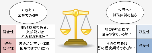 収益性、成長性は営業力の強さを表わすもので、経営上の「攻め」の部分を示します。健全性、資金効率性は財務体質の強さを表わすもので、経営上の「守り」の部分を示します。