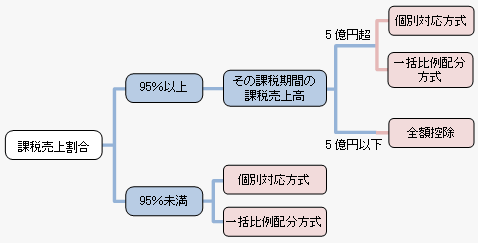 課税売上割合が95%以上で、かつ、その課税期間の課税売上高が5億円を超える場合には、仕入控除税額の計算は個別対応方式か一括比例配分方式で行うことになるのです。