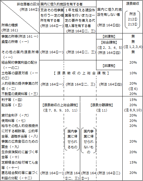 外国法人や非居住者に対する日本の所得税の課税対象及び源泉税率は、所得税基本通達164-1に以下のように要約されています。