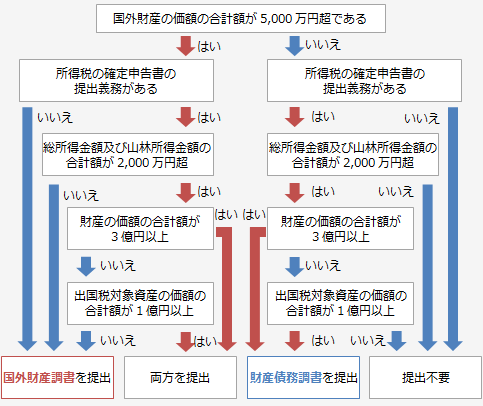 こちらの制度は、「確定申告書を提出しなければならない方」が対象者の前提となり、その年分の総所得金額などが2千万円を超え、かつ、その年の12月31日において、その価額の合計額が3億円以上の財産又はその価額の合計額が1億円以上の国外転出特例対象財産を有する方については、その財産の種類、数量及び価額並びに債務の金額その他必要な事項を記載した調書を、その年の翌年の3月15日までに、所得税の納税地の所轄税務署長に提出することを義務付けるというものです。