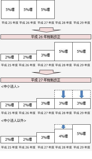 所得拡大促進税制は、賃上げを行った企業へのインセンティブ機能を強化する観点から、平成25年度税制改正で創設されました。当初、3年間の時限措置でしたが、平成26年度、平成27年度の税制改正で要件緩和と2年間の期限延長がなされ、トータル5年間の措置になっています。