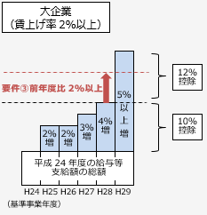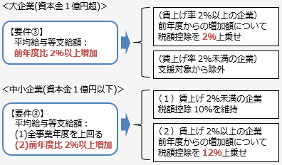 中小企業者等以外の法人について、平均給与等支給額が比較平均給与等支給額を超えることとの要件を、平均給与等支給額から比較平均給与等支給額を控除した金額のその比較平均給与等支給額に対する割合が2%以上であることとの要件に見直すとともに、控除税額を、雇用者給与等支給増加額の10%と雇用者給与等支給増加額のうち雇用者給与等支給額から比較雇用者給与等支給額を控除した金額に達するまでの金額の2%との合計額(現行:雇用者給与等支給増加額の10%)とする。