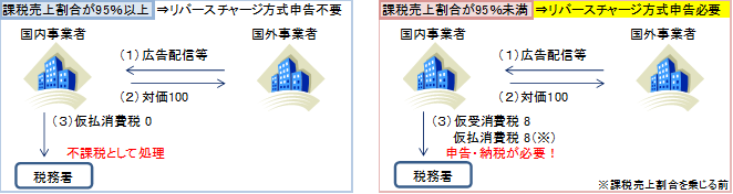 国内事業者が「事業者向け電気通信利用役務の提供」を国外事業者から受けた場合、本来はその国外事業者が納付するべき消費税を、国外事業者に代わって国内事業者が申告・納税を行う方法をリバースチャージ方式といいます。ただし、課税売上割合が95%以上の事業者は、当面の間、リバースチャージ方式により申告する必要はなく、従来と同様に消費税不課税取引として処理することになります。