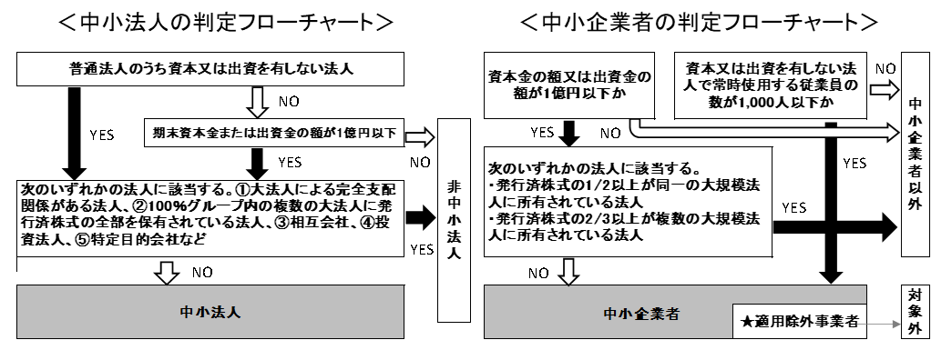 中小法人と中小企業者の判定及び適用除外事業者の関係をフローチャートで示すと次の通りとなります。