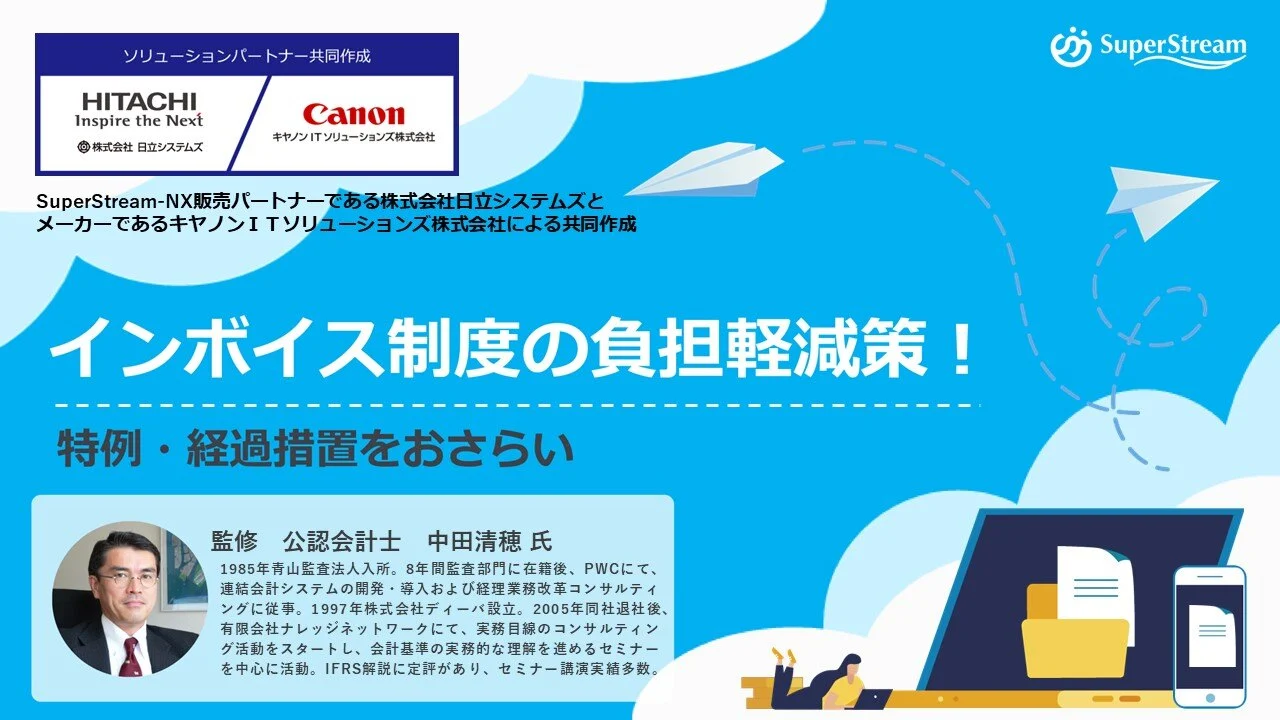 インボイス制度によって増加した負担を、軽減するための制度や対策についてまとめています。SuperStream-NX販売パートナーである株式会社日立システムズと、キヤノンITソリューションズ株式会社による共同制作ホワイトペーパーです。