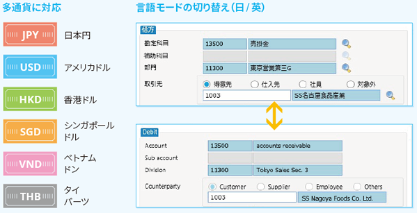 SuperStream-NX 会計ソリューションは、海外で事業展開を図る『日本発グローバル企業』 のビジネスを強力にサポートします。複数通貨による伝票入力・残高管理に標準対応し、 拠点や会社別に通貨を設定できます。 さらに言語モード(日本語、英語、タイ語、中国語)をユーザ側で自由に切り替えて 利用できます。