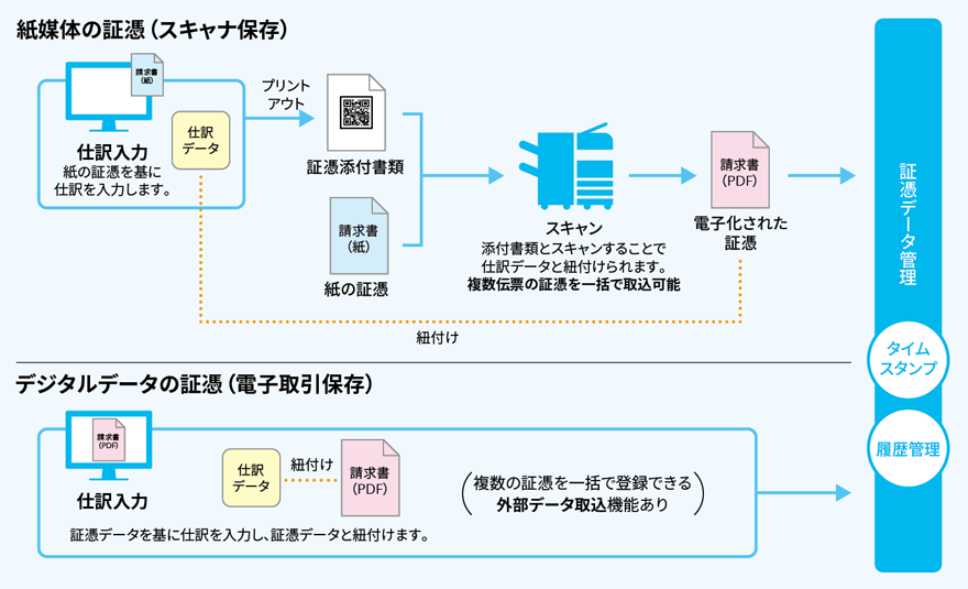 紙媒体の証憑は、仕訳入力後、QRコード付きの証憑添付書類を証憑とともにスキャンすることで、自動で仕訳データに紐付けられます。複数の証憑を一括で処理することも可能です。データの証憑は仕訳入力時に証憑データと紐付けを行います。こちらも外部データ取込により、一括で処理することが可能です。