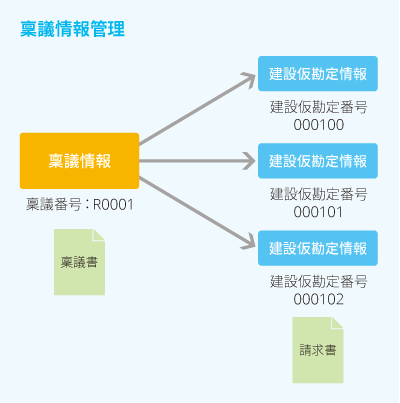 メモとして稟議情報を登録することができます。登録した稟議情報に対して、建設仮勘定の明細情報を登録することで、稟議情報と建設仮勘定情報は親子関係になります。