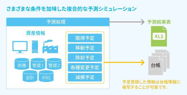 将来発生する費用(減価償却費、課税標準額、除去債務利息)を予測計算し把握することが可能です。費用があらかじめ把握できるので新たな設備投資計画や立案など意思決定の迅速化に貢献します。また、事前に既存資産の移動予定や処分予定などの情報を登録しておくことで、それらを加味した予測計算が行えます。予定登録した情報は、固定資産台帳に反映することが可能です。