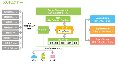 SuperStream-NX システム連携ツールは、データのWeb出力(動的HTML作成)、Excel出力、メール送信が可能です。システム上に蓄積されたデータを、さまざまな方法で有効活用することができます。