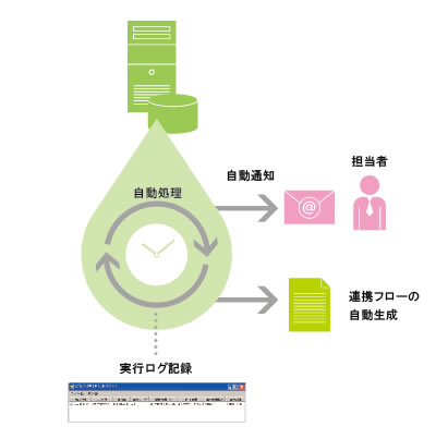 サーバ側でスケジューラー機能による自動処理を実行することで、手作業なしで異なるシステム間のマスタやデータの連携をシームレスに行うことができます。データベースやファイルを監視対象として定義することで、それらの情報が更新されたタイミングで連携スクリプトを実行し、データを更新するなどの設定も可能です。