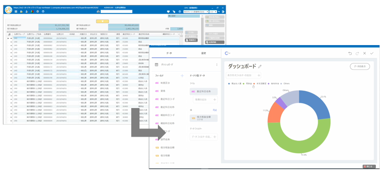 ユーザが自由度の高い表集計レポートを作成することが可能です。列/行の任意配列やソート/フィルタ、絞り込みなども自由自在。作成したレポートはそのままExcelやPDFへ出力することができます。