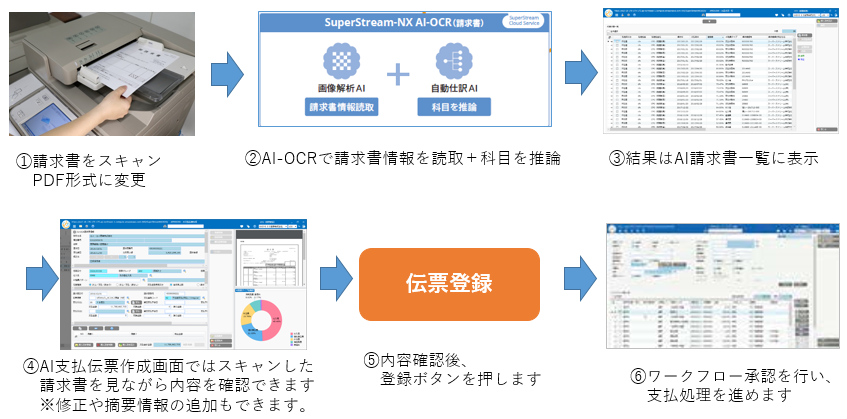解析結果は一覧で表示されるので、担当者は内容を確認し登録ボタンを押すと、自動で仕訳データ・支払データが作成されSuperStream-NX統合会計に反映されます。