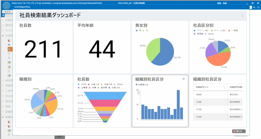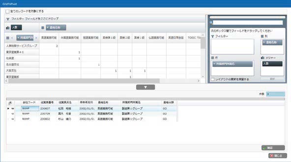 使い勝手の良いピボット集計機能を標準で装備しています。年齢別/部門別の統計資料作成など、ユーザが任意かつ自由なレイアウトで集計することができます。また、集計結果から個人情報へドリルダウンしたり、そのままExcelへ出力し、二次加工することも可能です。