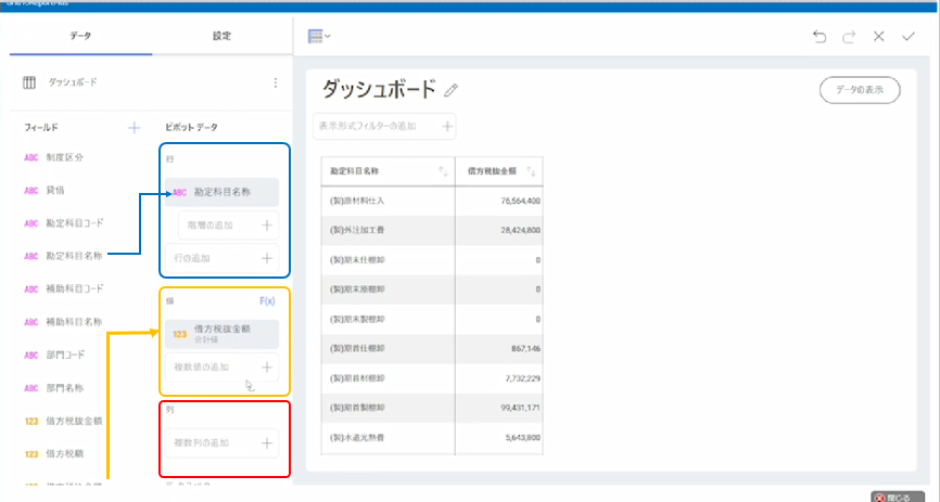 フィールド一覧から行、値、列に表示したい項目を配置します。