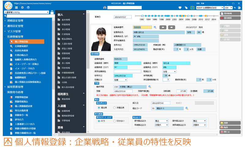 従業員のスキル情報管理を実現する人事管理を中心に、複雑な給与体系にも柔軟に適応可能な給与管理機能を提供。時間や場所を選ぶことなく人事に関連した申請や照会が可能になる人事諸届・照会機能で人事業務を支援しながら、基準給スライド方式など退職金一時金計算にも対応できる退職金管理機能が備わった人事給与ソリューションです。