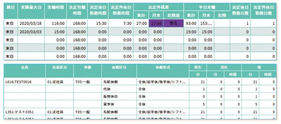 残業管理は、年 /月/月平均/週で管理可能。残業予測や36協定違反予備軍を表示することで労務規定順守を実現します。