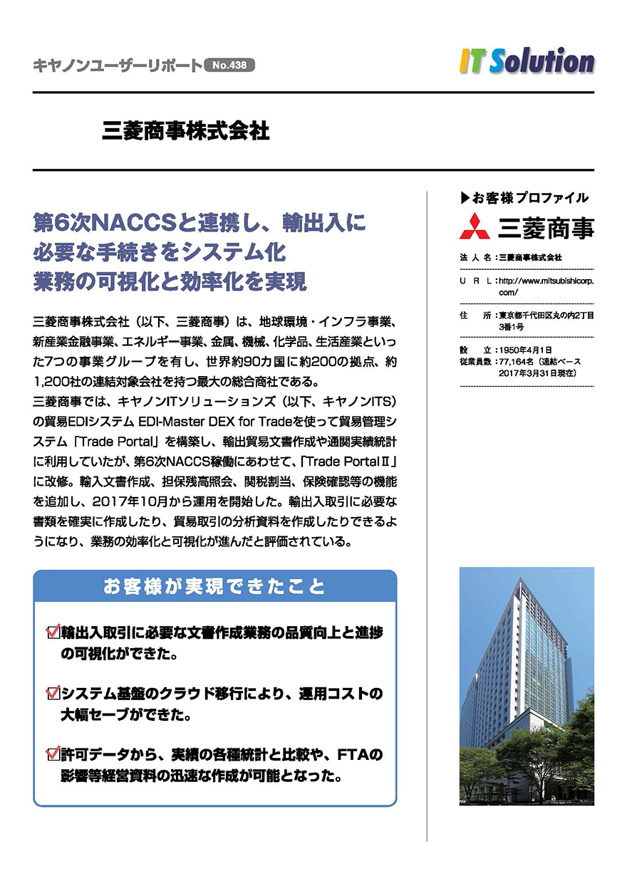 - 三菱商事株式会社様では、第6次NACCS稼働にあわせて、「Trade PortalⅡ」に改修。輸入文書作成、担保残高照会、関税割当、保険確認等の機能を追加し、2017年10月から運用を開始した。輸出入取引に必要な書類を確実に作成したり、貿易取引の分析資料を作成したりできるようになり、業務の効率化と可視化が進んだと評価されています。