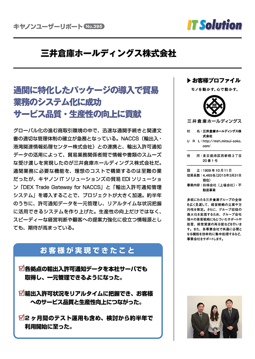 - グローバル化の進む商取引環境の中で、迅速な通関手続きと関連文書の適切な管理体制の確立が急務となっています。 三井倉庫ホールディングス株式会社様では、NACCS(輸出入・港湾関連情報処理センター株式会社)との連携と、輸出入許可通知データの活用によって、貿易業務関係者間で情報や書類のスムーズな受け渡しを実現しました。
