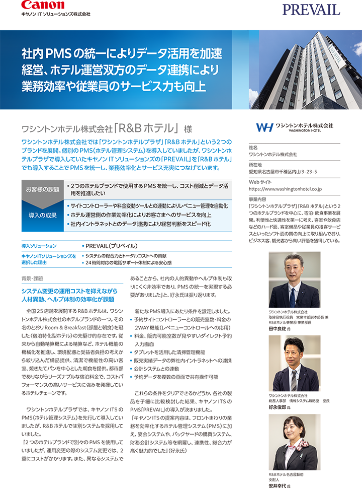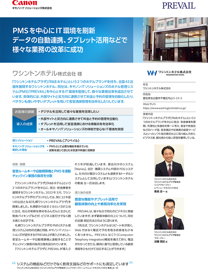 ワシントンホテル株式会社では「ワシントンホテルプラザ」「ワシントンR&Bホテル」という2つのブランドを展開。個別のPMS(ホテル管理システム)を導入していましたが、ワシントンホテルプラザで採用したキヤノンITソリューションズの「PREVAIL」による業務改革に成功。「ワシントンR&Bホテル」でもPMSを統一し、業務効率化とサービス充実につなげています。