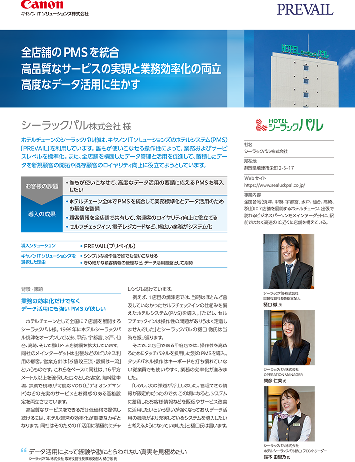 高品質なサービスをできるだけ低価格で提供し続けるには、ホテル運営の効率化が重要なカギと考える同社が導入したのがホテルシステム(PMS)「PREVAIL」。誰もが使いこなせる操作性によって、業務およびサービスレベルを標準化。また、全店舗を横断したデータ管理と活用を促進して、蓄積したデータを新規顧客の開拓や既存顧客のロイヤリティ向上に役立てている。