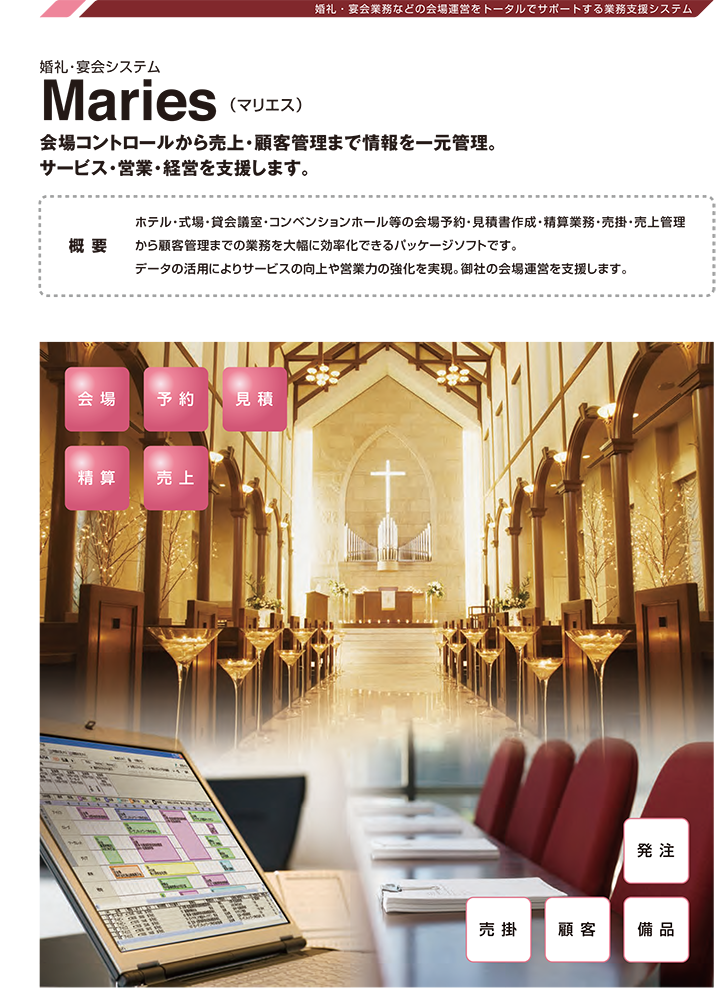 「マリエス」はホテル・式場・貸会議室・コンベンションホール等の会場予約・見積書作成・精算業務・売掛・売上管理から顧客管理までの業務を大幅に効率化できるパッケージシステムです。データの活用によりサービスの向上や営業力の強化を実現。御社の会場運営を支援します。
