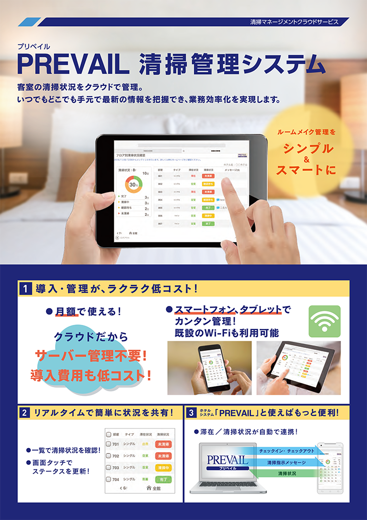 PREVAIL 清掃管理システムは、客室の清掃状況をタブレットやスマートフォンで管理するクラウドサービスです。