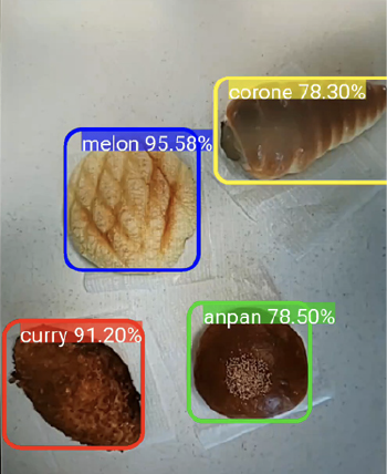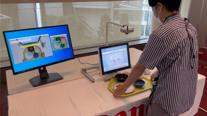 俯瞰映像による判定を応用したのが「トレー型認識」です。商品をカメラの下に置くことでトレー上の商品の数と種類を認識します。バーコードが付いていない商品の会計や、在庫の入出庫管理に適用可能です。