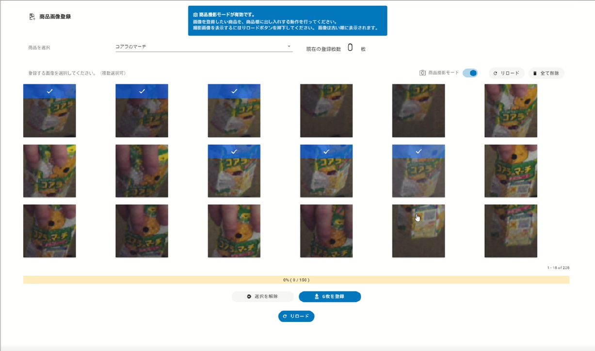 「StoreMotion」の稼働にあたっては事前の商品登録(学習作業)が必要になります。カメラの下に商品をかざし、連続的に撮像することで、商品を登録していきます。1商品について、数分で学習・登録が可能です。なお、商品認識は店舗照明や外光に影響されるため、原則として店舗ごとに商品登録作業が必要となります。