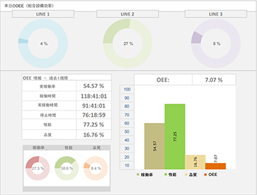 総合設備効率(OEE)や設備稼働率、製造状況の表示や分析が可能です。