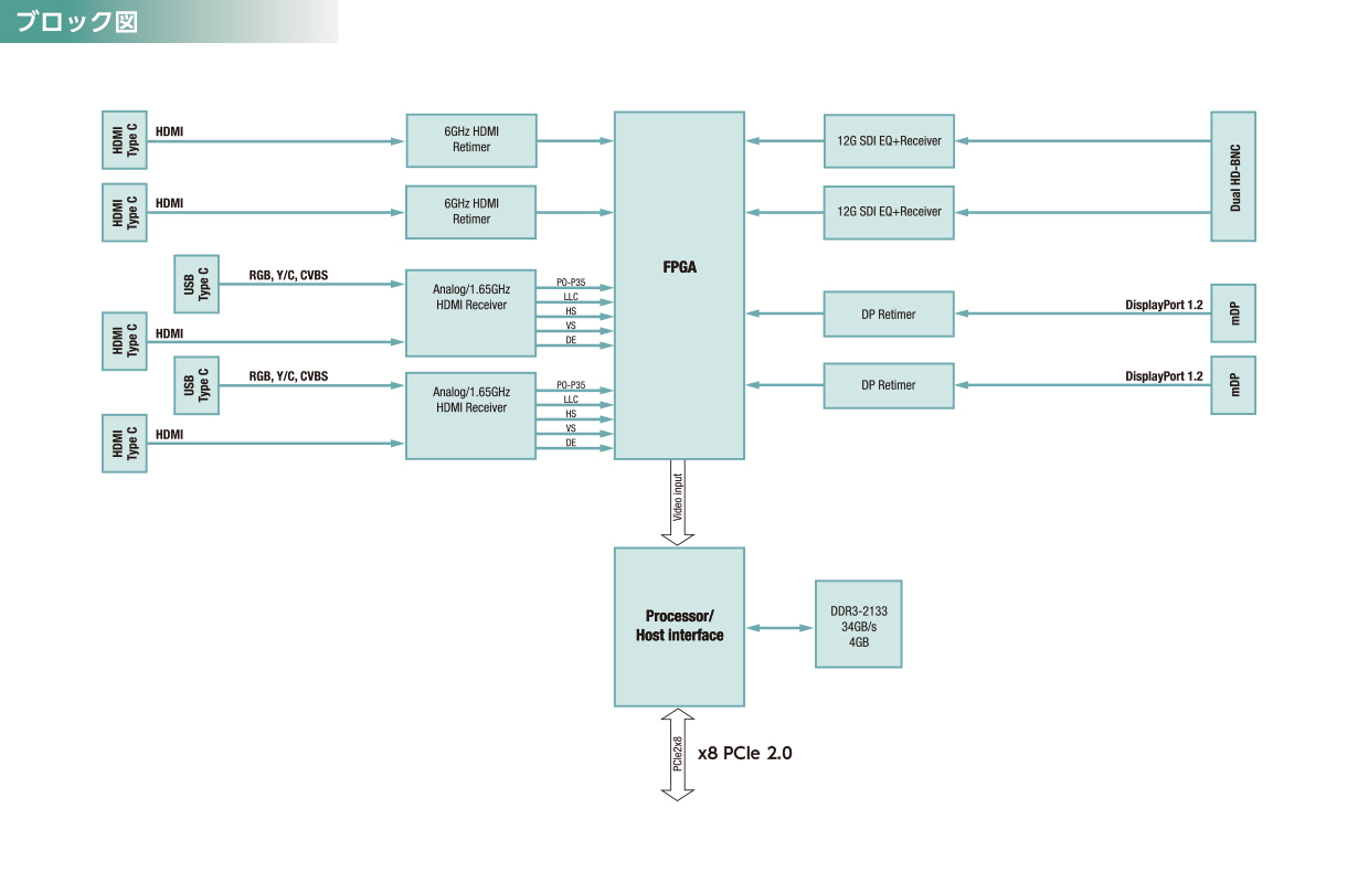 - アナログ(RGB,Y/C,CVBS)、single-link DV(I HDMI経由)、DisplayPort1.2、HDMI、SD(I 12G)