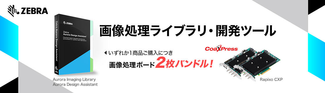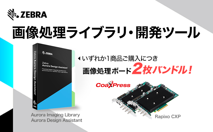 Zebra Technologies製、画像処理ライブラリ「Aurora Imaging Library」および「Aurora Design Assistant」を、現在、数量限定の特別価格にてご提供中です。さらに今なら、いずれかの製品をご購入いただくと、CoaXPress 2.0対応フレームグラバボードを2枚、無償でバンドルいたします。