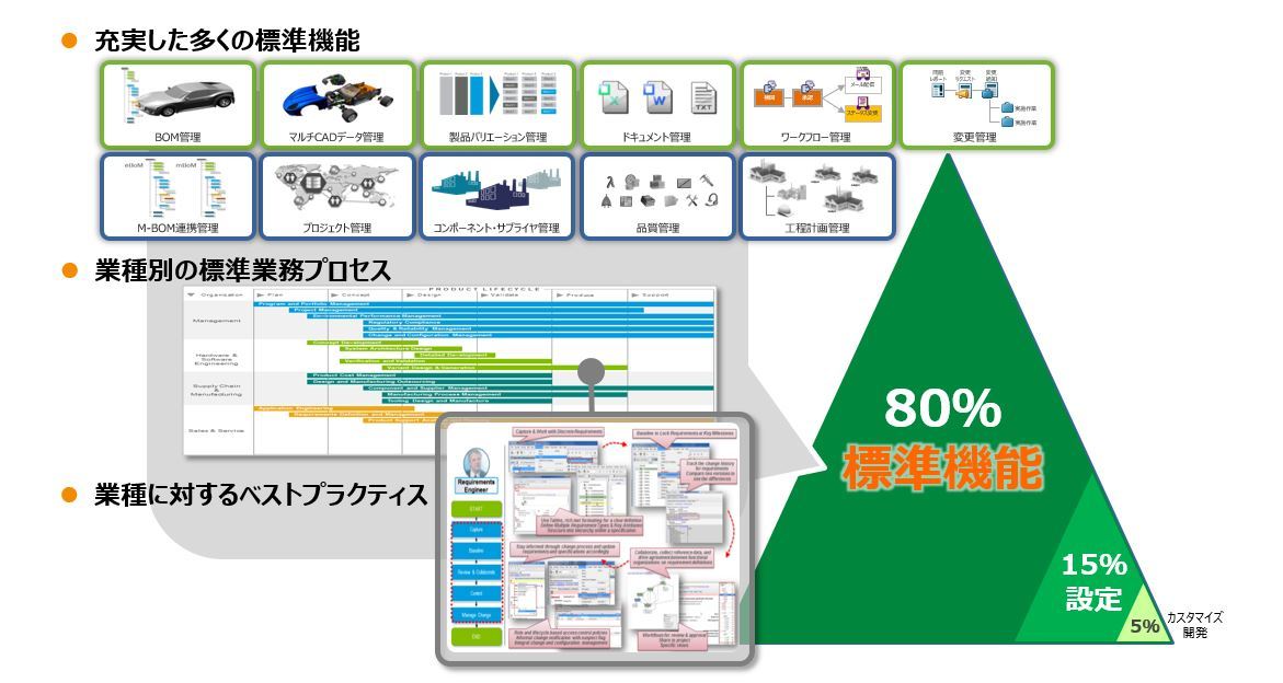 導入事例を基に機能群の組み合わせや運用方法をご提案させていただくことで、ほぼカスタマイズなしでPLMシステムを導入できます。