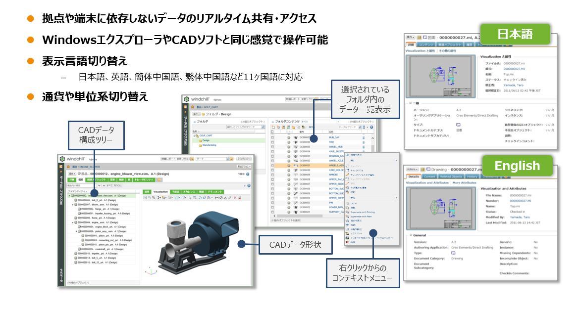 WindchillはWebベースですので、IEやFirefox、SafariといったWebブラウザで世界中のどこからでもアクセスできます。ビューア表示もあるので、CADをお持ちでない方もCADデータの閲覧が可能です。