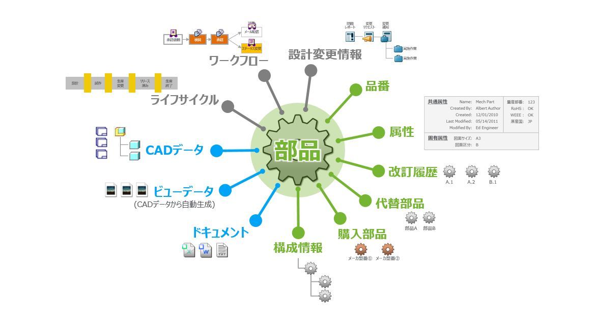PDM機能は、ドキュメント管理やワークフロー管理をベースに、BOM情報管理はもちろん、様々なCADのデータ管理、製品バリエーションを作成・管理する機能もございます。