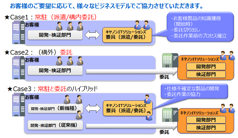 第三者検証サービス専門企業とは異なり、キヤノン製品を中心に30年以上組み込みソフトウェア開発に携わってきているので、開発から評価までサポートが可能です。また、ソフトウェア会社であるため必要なツールを作成することが可能です。
